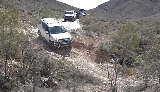 We were given the options at $80 per day to drive on the Bendleby Ranges 4WD tracks or the Hungry Ranges 4WD tracks. After being informed about the difficulty of the tracks in the Hungry Ranges, we settled for one day in the Bendleby Ranges. We heard a comment from one visitor “I’m glad I went as a passenger to the Hungry Ranges and not in my own car. 1½ hours to drive 2km of Billy Goat Ridge”. Our Bendleby Ranges drive of 41km took us 3¼ hours averaging 13km/hr, but it was interesting with great views, more pine forests and some shorter sections of challenging rocky creek beds. Gum Gorge Road was another red gum delight, and as we climbed, we were more exposed to the strong wind, so down in the valleys was the best place for a morning tea stop. We continued to climb to the highest point, Marchant Hill lookout. We could see the trig point in the distance, but the road suddenly ended on the hill next to it. Again, super views. Our next target was Quarry Springs and the possibility of rare orchids. Unfortunately, neither a quarry nor orchids. As we were next to a walking track a few of the group decided to take a break from driving and hike to Hidden Valley campground along a dry riverbed. It was only a few kilometres return and quite pleasant.