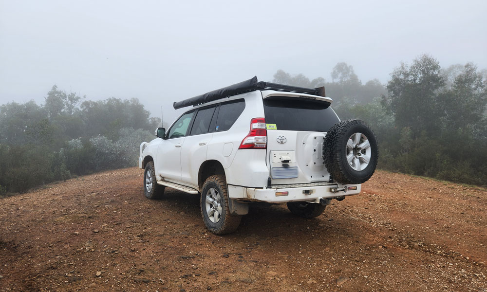 Leaving the hut, we headed further north to the Butcher Country Track. Still in mist and fog, we travelled a few kilometres before stopping to let a convoy of seven highly modified Toyota FJ40s pass. There were a couple of V8s, and six of the seven drivers sported beards. Apparently, one of the vehicles had been damaged earlier, and after travelling a short distance, we came upon a rock step which may have caused it. Colin managed to get through; however, the Prado would have struggled with ground clearance. Gary suggested using two stacked MaxTrax to build up a large rock, and this worked perfectly, allowing the Prado to clear the step without touching.