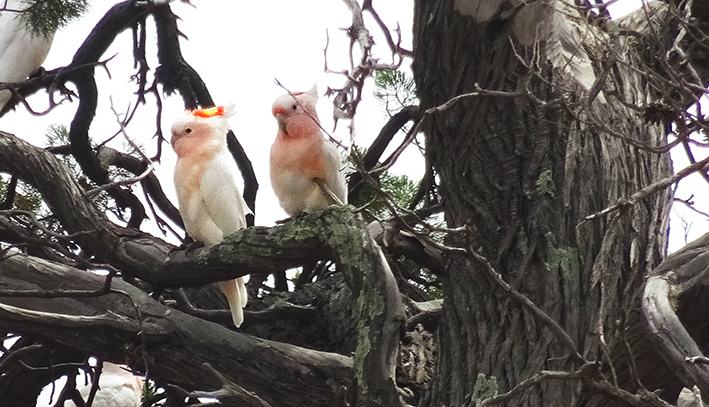 Major Mitchell Cockatoos were sighted before the salt museum where salt harvesting and loading implements are displayed.