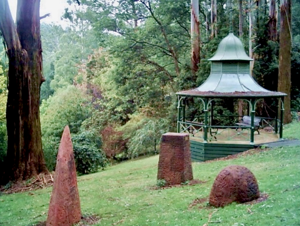 The weather was good enough to do the short walk to Burkes Lookout which is at the base of two of the TV transmission towers on Mt Dandenong. From there we had views looking west across the city of Melbourne and participants could recognise various features, in spite of slightly inclement weather. We returned to the car park then turned right along Ridge Road, then right into Mt Dandenong Tourist Road, then left past the shops in Olinda, and continuing on to Olinda-Monbulk Road, past the cricket club and Recreational Reserve. After that we turned right to Hacketts Road, past the Pirianda Gardens. It was a steep dirt road, suitable mainly for 4WDs. At the end of the descent, we turned left to Perrins Creek Road, then right into Sassafras Creek Road, headed for the Alfred Nicholas Memorial Gardens via Nobles Lane, another dirt road. We parked and enjoyed the first of several wonderful gardens. The Alfred Nicholas Memorial Gardens were once part of the Burnham Beeches estate, which was built in the early 1930s for Alfred Nicholas, who is known for ASPRO, the pain killer. There is a variety of trees and plants, including conifers, indigenous eucalyptus, and exotic shrubs.