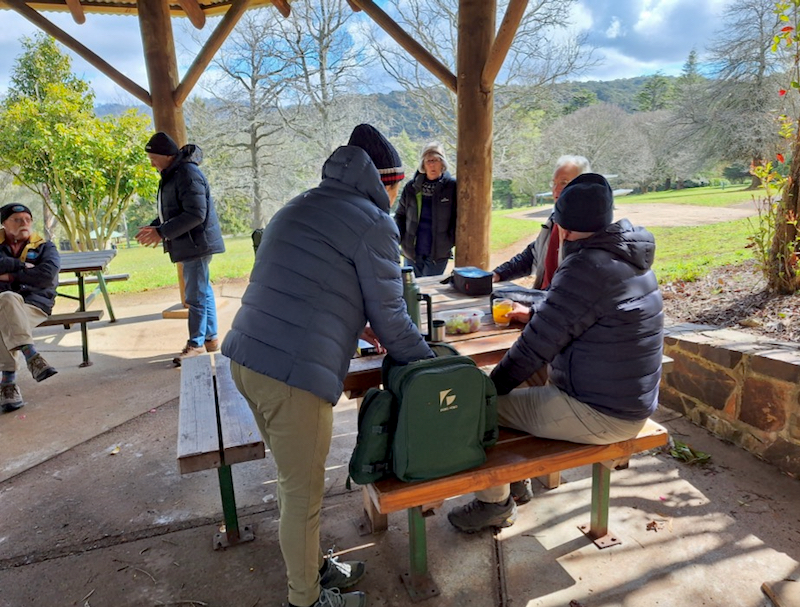 We then went via Hacketts Road, Olinda-Monbulk Road, Woolrich Road, Chalet Road, then onto Silvan Road (with its beautiful wattle trees in bloom) to Silvan Dam Reservoir via Stonyford Road. We had lunch in a rotunda, accompanied by an inquisitive magpie waiting for freebies.