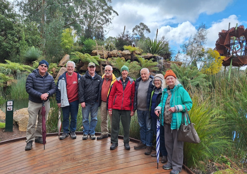At 11.16am we turned left from Nobles Lane to Vista Grove, Mizmaze Road, then Sherbrooke Road, a bitumen road, to the George Tindale Memorial Gardens in Sherbrooke. George Tindale was an Agricultural Scientist who bought this garden, which was formerly called Pallants Hill, with his wife Ruth in 1958, and after George’s death Ruth continued his work. After her death the garden was bequeathed to the Victorian Conservation Trust. It is now managed by Parks Victoria. It is a cool climate garden, smaller than some of the other gardens, but there are all-year-round and rare plants. There are mountain ash trees, and lots of beautiful plants and flowers, including magnolias, rhododendrons, camellias, and hydrangeas, and Angela was particularly fascinated by the macadamia tree which is growing in an unsuitable climate!